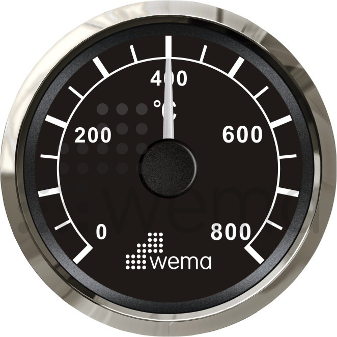 Specifikationer: Arbetsområde: 0-800°C Röd eller gul bakgrundsbelysning Driftstemperatur -25 till +70°C Vattentät, IP 67 Resistent mot ozon, UV och saltvatten Helt korrosionsskyddad Strömförsörjning: 12/24 V Strömförbrukning: 0-130mA Håltagning: 52 mm Yttermått: 56 mm Djup: 60 mm