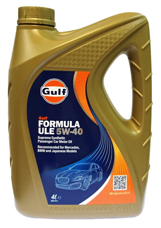 Gulf Formula ULE-serien är högpresterande, syntetiska motoroljor med ultralåga utsläpp för personbilar, som uppfyller mid SAPS-kraven (Sulphated Ash, Phosphorous & Sulphur). Dessa oljor är speciellt utvecklade för att förlänga livslängden och bibehålla effektiviteten hos efterbehandlingssystem i både bensin- och dieseldrivna personbilar. Oljan ger enastående rengöringsförmåga och slitageskydd, samtidigt som den minimerar avlagringar i motor och turboladdare, vilket ger överlägsen totalprestanda. Den överträffar de senaste lågutsläppskraven från ledande biltillverkare som Daimler, VW och Porsche. Rekommenderas till bensinmotorer samt dieselmotorer som uppfyller Euro 4 krav och är försedda med partikelfilter. Longlife olja med lågt askinnehåll och den senaste mid-SAPS teknologin som är anpassad för trevägskatalysatorer (TWC) ACEA A3/B4 ACEA C3 API SM/CF MB 229.51 BMW LL-04 VW 502.00/505.00/505.01 Porsche (förutom Cayenne V6)