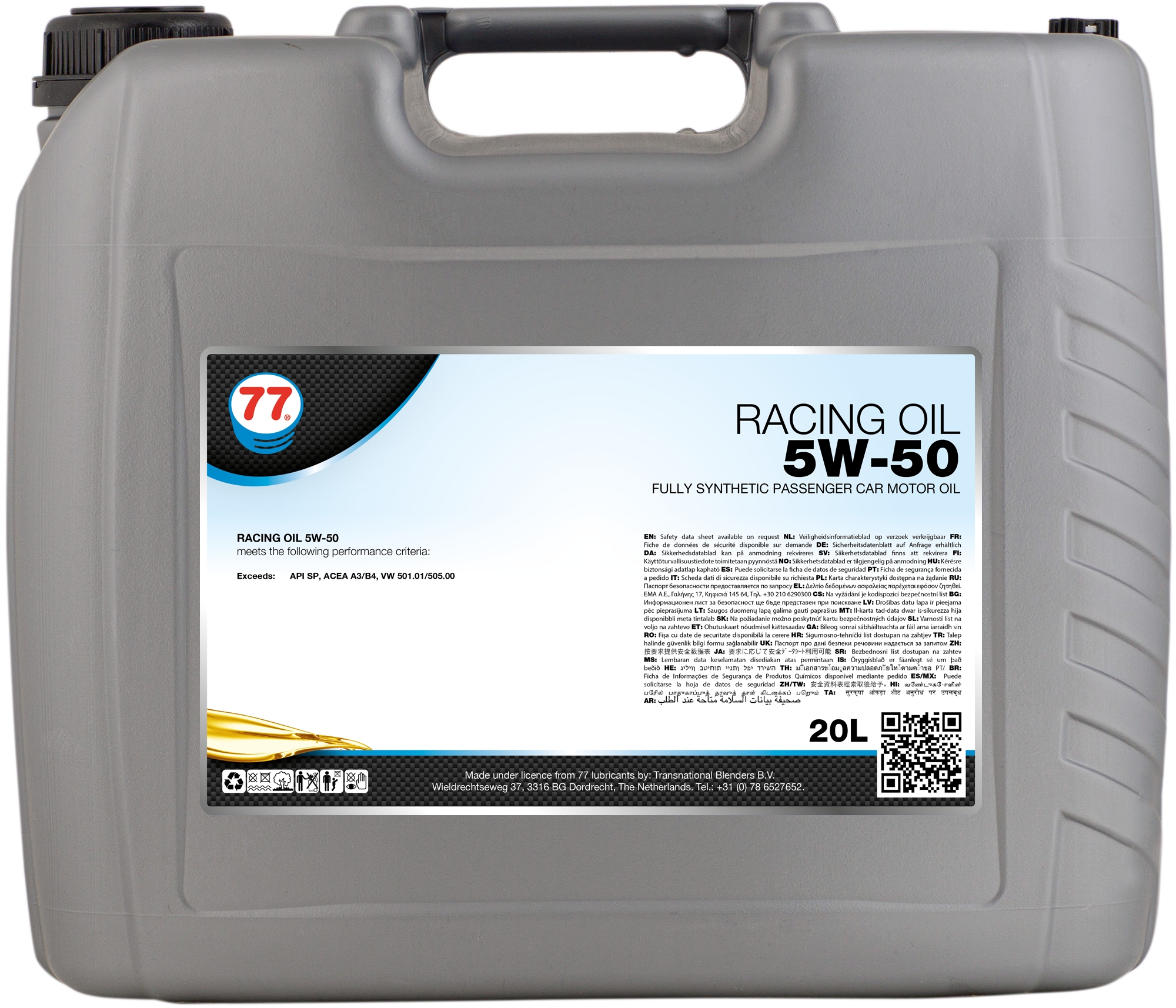 Racing Oil 5W-50 levererar extrem prestanda i bensin-, diesel- och gasdrivna personbilar, med eller utan turbo, som arbetar under höga temperaturer och belastningar. Baserad på högkvalitativ syntetisk basolja i kombination med ett unikt additivpaket som säkerställer följande egenskaper: -Utmärkt termisk stabilitet och oxidationsstabilitet. -Goda dispergerande och rengörande egenskaper. -Utmärkta köldegenskaper för smidig kallstart. -Skydd mot slitage, korrosion och skumbildning. -Lämplig för extrema och krävande driftsförhållanden. Uppfyller följande prestandakrav: API SP · ACEA A3/B4 · VW 501.01/505.00