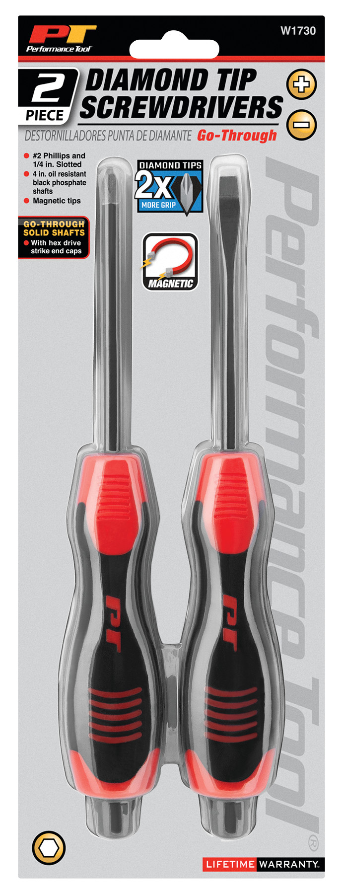 Diamond coated tips provide superior gripping power to resist slippage and allow for greater torque Ergonomic non-slip molded grips for improved comfort and control Go-through solid shafts with hex drive strike end caps Heat treated oil resistant black phosphate shafts with magnetic tips Includes #2 x 4" phillips and 1/4" x 4" slotted